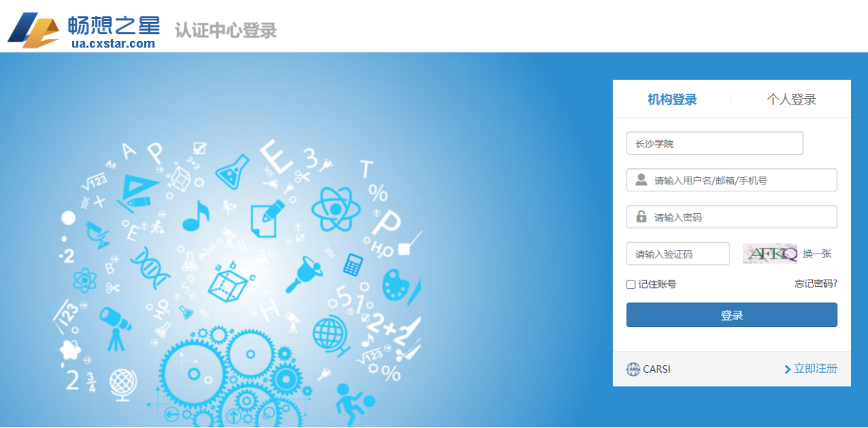 在【机构登录】→输入【学校名称】:长沙学院 →输入【用户名】:csxy02→输入【密码】:123456→输入【验证码】即可登录。