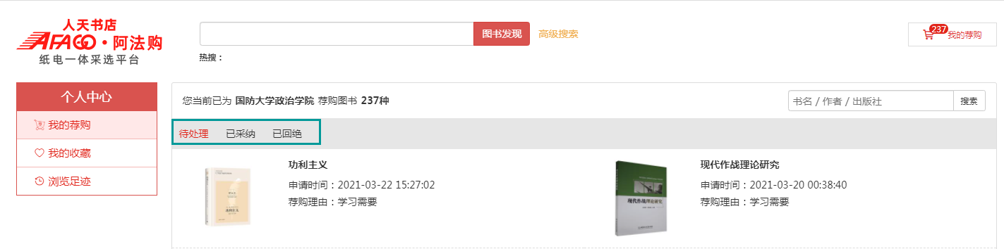 3.我的荐购:【个人中心】→【我的荐购】中可查看到所有的荐购书目。