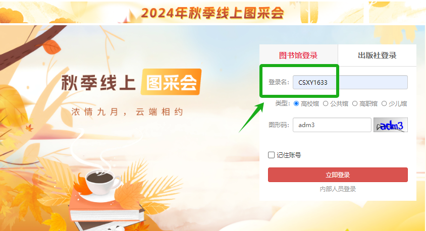 选择【图书馆登录】→输入【用户名】:CSXY1633 →平台自动识别【图书馆名称】→选择单位属性【高校馆】→输入【图形码】即可登录。
