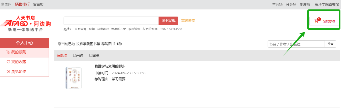 3.我的荐购:【个人中心】→【我的荐购】中可查看到所有的荐购书目。