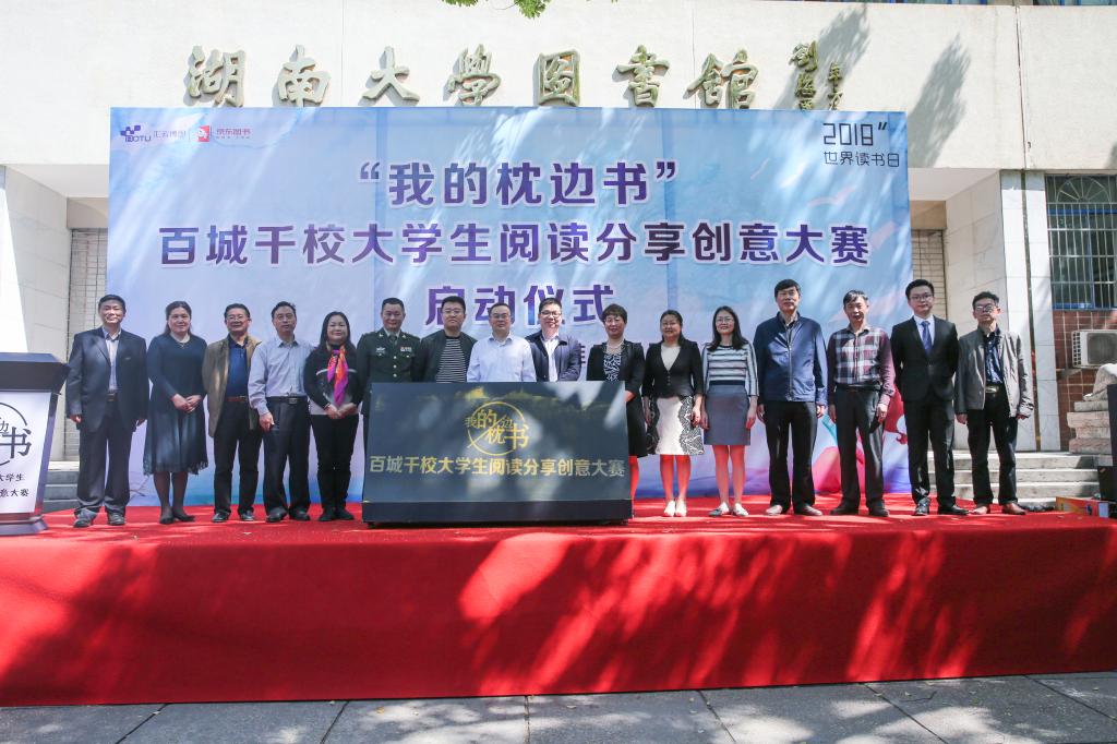 2018年4月19日上午,为迎接第23个世界读书日的到来,由京东图书文娱数字阅读部、北京汇云博图联合举办的“我的枕边书”百城千校大学生阅读分享创意大赛启动仪式在湖南大学图书馆举行。来自重庆大学、东北大学、西安电子科技大学、中南财经政法大学、哈尔滨工业大学、国防科技大学、中南大学等数十家高校图书馆馆长、高校学生代表以及中央电视台等媒体单位100多人出席启动仪式。我校图书馆馆长喻秋兰教授受邀出席此次活动,并亮相启动仪式现场。中央电视台新闻频道也对此次启动仪式进行了跟踪报道。