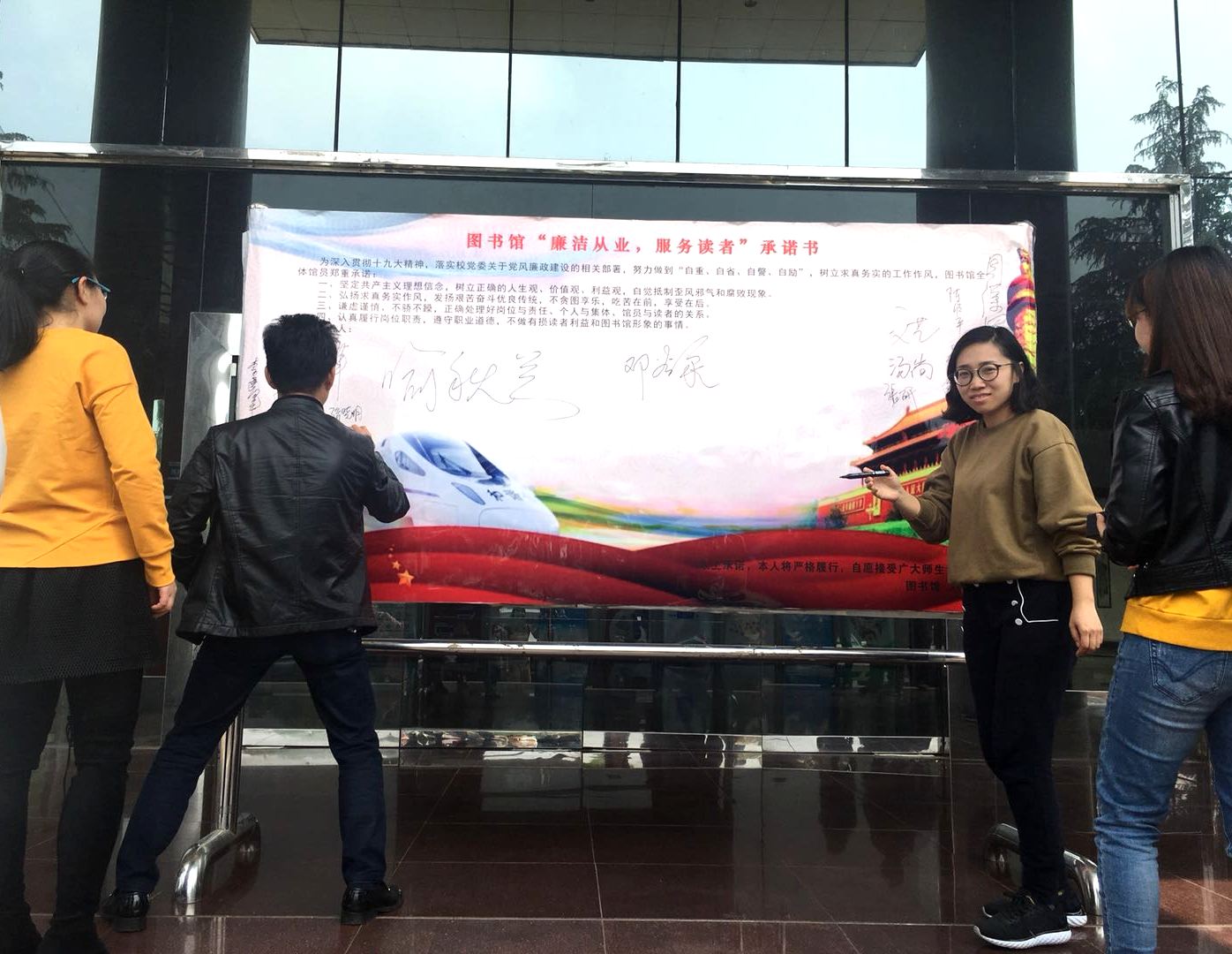 签名结束后,“廉洁从业,服务读者”承诺牌将长期摆放于图书馆门口,提醒全体馆员和广大师生读者保持头脑清醒,杜绝侥幸心理,努力做到“自重、自省、自警、自励”,让廉洁的清风吹遍学校的每一个角落。