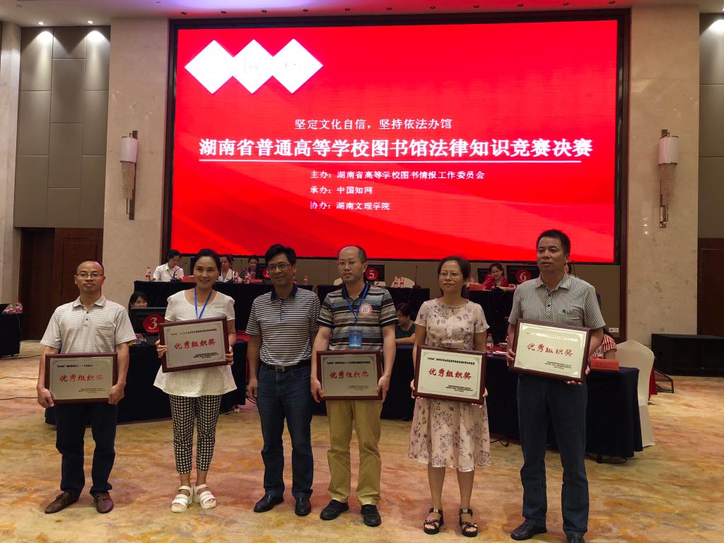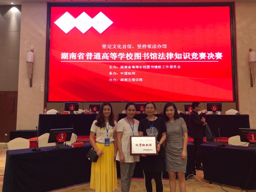 2018年6月20日,由湖南省高等学校图书情报工作委员会主办的“知网杯”以“坚定文化自信,坚持依法办馆”为主题的图书馆法律知识竞赛决赛与颁奖在常德举行,我馆刘海萍副馆长率由张研、陈好敏、李玉珑老师组成的代表参加了此次活动。