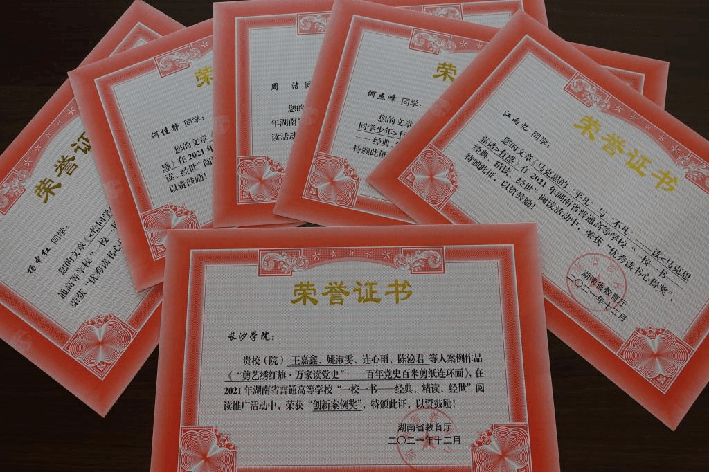 日前,湖南省教育厅发布《关于2021年全省普通高等学校“一校一书”阅读推广活动评选结果的通报》(湘教通〔2022〕16号),我校在2021年度全省普通高校“一校一书”阅读推广活动中收获颇丰,一举斩获三大奖项:艺术设计学院王嘉鑫老师指导的“‘剪艺绣红旗·万家读党史’——百年党史百米剪纸连环画”案例获得“创新案例奖”;江雨忆、杨中红、何杰峰、周洁、何佳静五位同学获得“读书心得奖”;图书馆馆员王诗弈获得“优秀阅读推广人”称号。