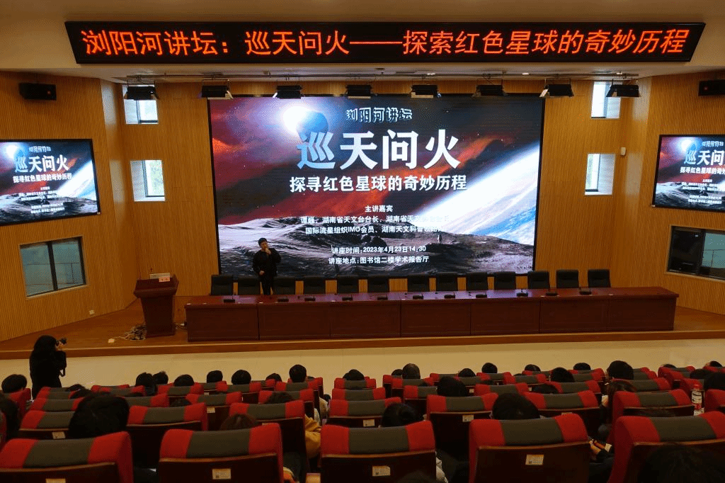 “火星长什么样子?”“火星上面究竟有什么?”4月23日下午,围绕科普书籍推广,聚焦年度精读图书《三体》,图书馆举办《浏阳河讲坛》天文类主题讲座《巡天问火——探索红色星球的奇妙历程》。讲座现场,湖南省天文协会会长、国际流星组织IMO会员、湖南天文科普领路人谭巍,通过向读者抛出一个个关于火星的有趣话题,展示一幅幅高清晰度的火星照片,逐步揭开火星的神秘面纱,并介绍我们中国的火星探测计划。讲座期间,谭巍老师与现场读者进行了航天知识的互动问答,现场氛围十分活跃。讲座结束后,学校天文协会会长、21数学2班的龚胤文同学激动地说道:“谭老师的讲座生动有趣,不仅让我看到了奇妙太空中的火星模样,深切感受到我国航天事业取得的伟大成就,也进一步坚定了自己的航天梦。明天就是世界航天日,这个讲座恰逢其时,希望自己通过努力学习也能为我国的航天事业出一份微薄之力。”