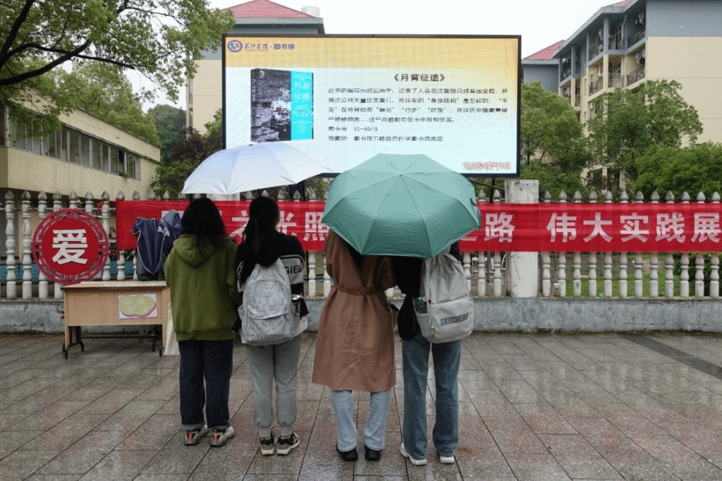 《红船启航》《红星照耀中国》《许渊冲百岁自述》……一本图书,一幅画面,一个世界。学校勤思广场电子屏上轮播着“世界读书日”主题图书,读者或驻足观看,或捧书阅读,这种读书场景在校园随处可见,这是我校“世界读书日”读书活动的一个缩影。