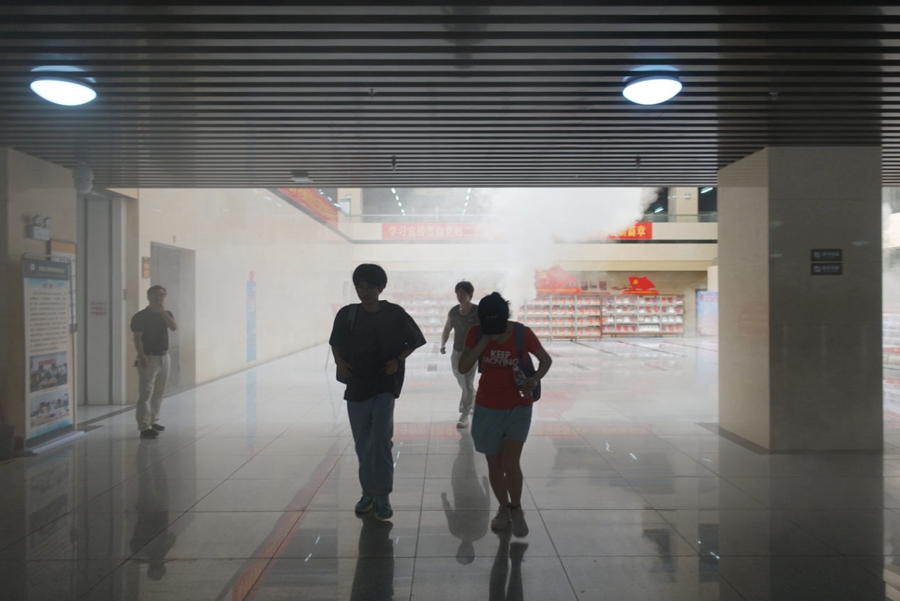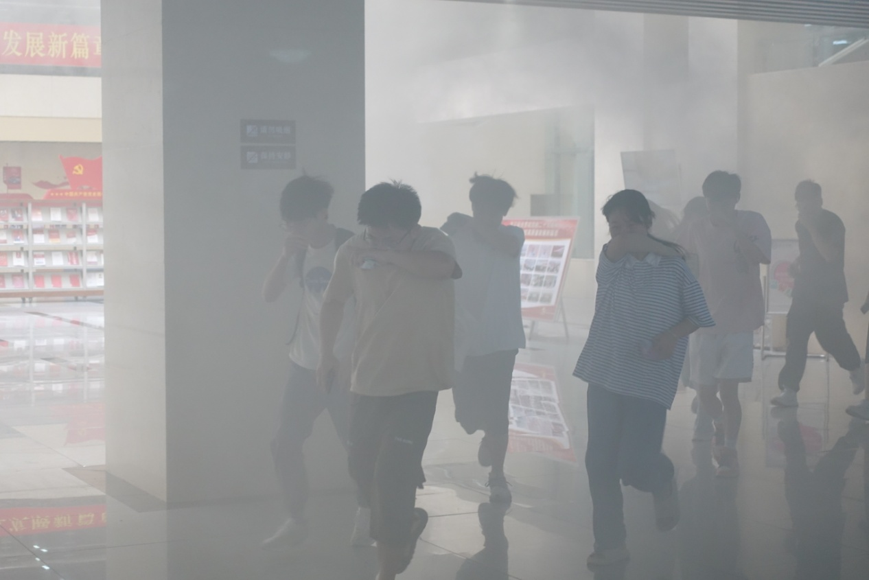 演练前期,图书馆制定详细的《逃生疏散演练方案》,并召开专题会议,精心安排布置。演练过程中,图书馆老师在各楼层进行疏散指挥,读者们一手用毛巾或衣服折叠捂住口鼻,一手搭着前方同学的肩膀,弯腰前进,迅速撤离图书馆,跑到“安全地带”,整个过程虽然紧张但却忙而不乱、繁中有序。