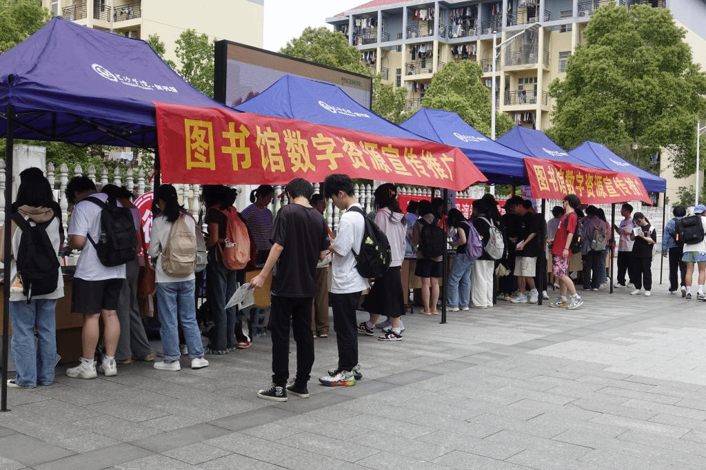 为提升学生信息素养,更好解锁各数据库的功能,4月24日,图书馆在勤思广场举行了“数字资源推广”现场宣传活动,参加此次活动的有中国知网、世纪超星、湖南纬度、智联起点、湖南弘文在线、北京搜知、北京正见知行等10个数据库公司。活动现场,各参展人员重点介绍数据库的使用方法,并现场解答读者在数据库使用过程中的常见问题。读者纷纷驻足观看数据库宣传展板,使用手机扫描二维码,体验数字资源,并现场参与抽奖活动。