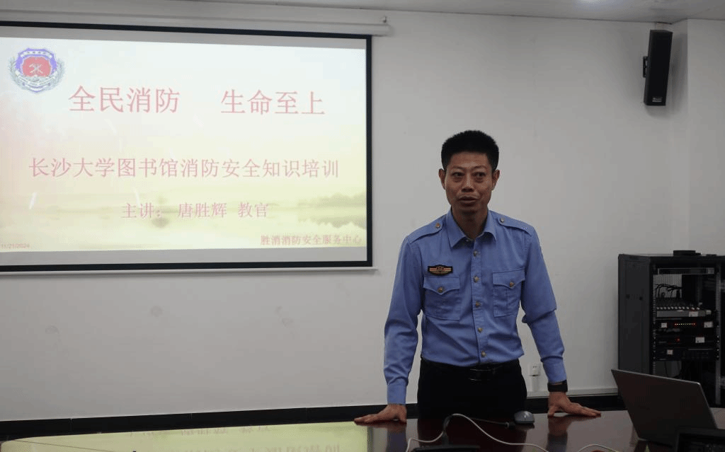 11月21日下午,图书馆在一楼会议室举办“全民消防、生命至上”为主题的消防安全知识培训讲座。讲座特邀胜消消防安全服务中心唐胜辉教官主讲,全体馆员参加,王永启馆长主持讲座。