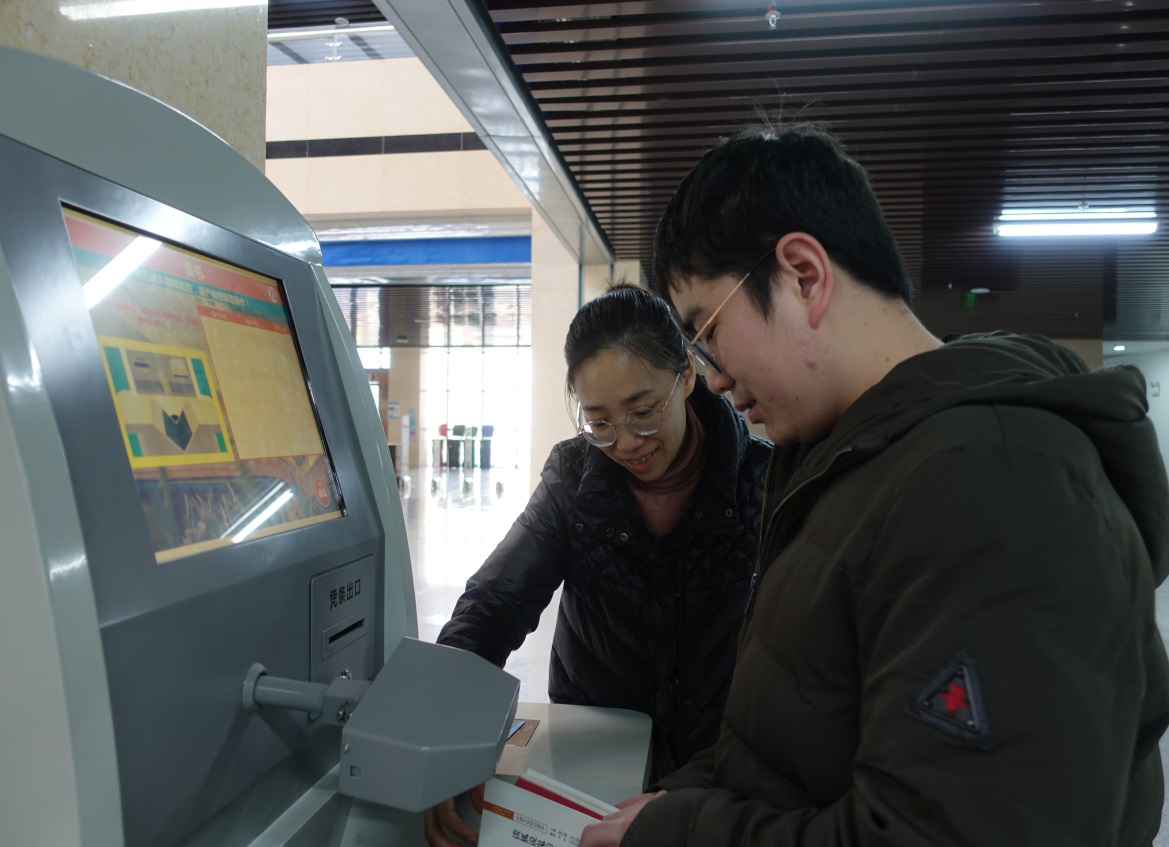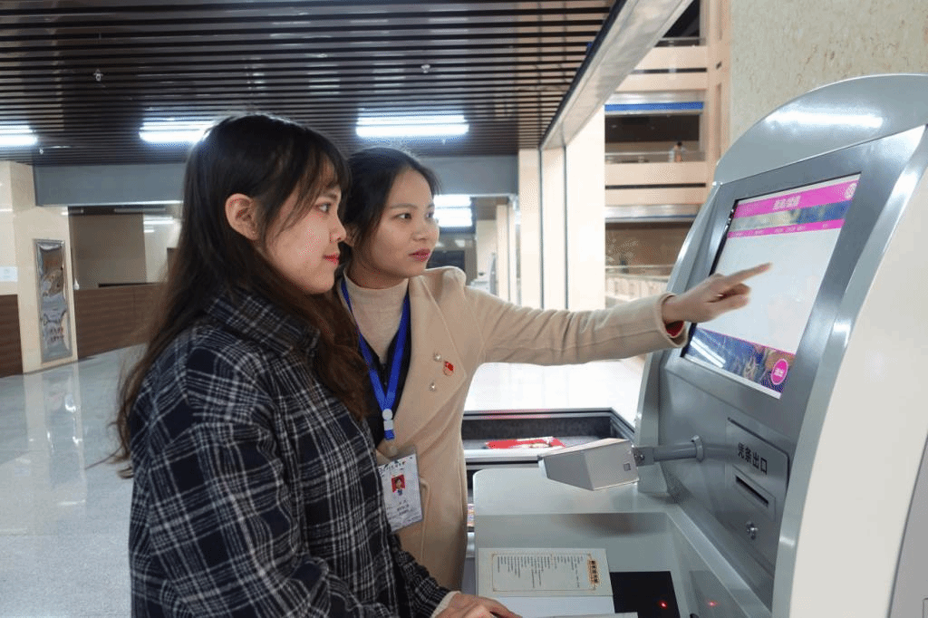 “党员先锋岗”的同志耐心指导读者使用自助借还机(一)