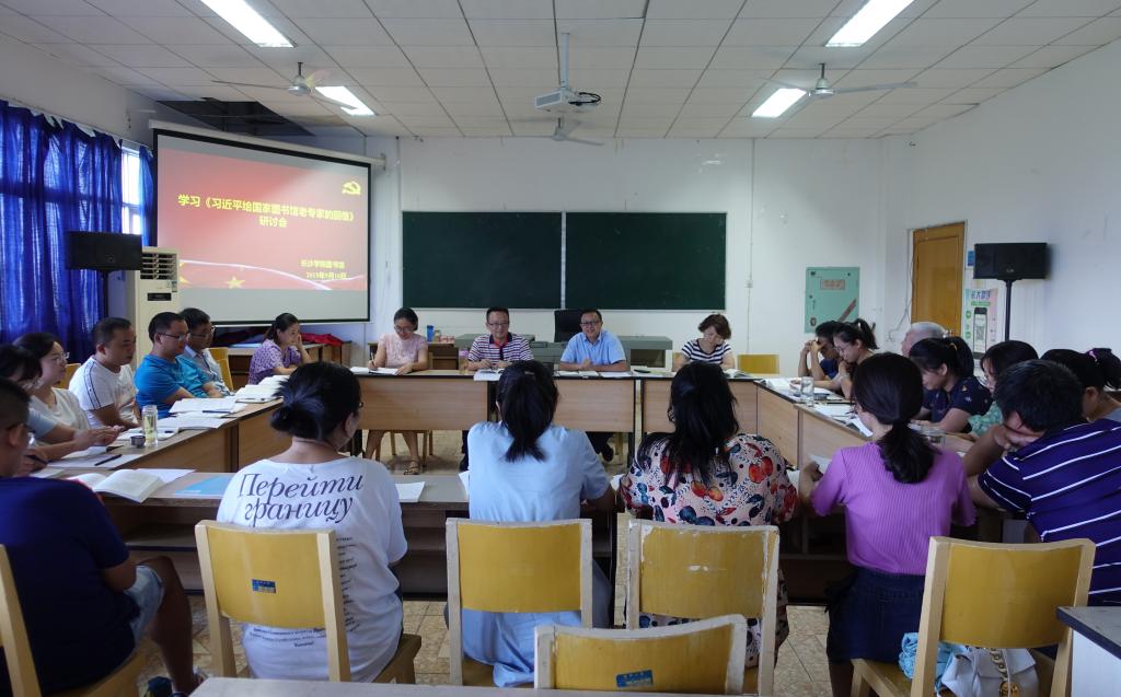 9月9日下午,《习近平给国家图书馆老专家的回信》引发图书馆教职员工热议,“图书馆是国家文化发展水平的重要标志,是滋养民族心灵、培育文化自信的重要场所”,“坚持正确政治方向,弘扬优秀传统文化,创新服务方式,推动全民阅读”等话语迅速传播。9月10日下午,结合九月份主题党日活动,图书馆党总支在512会议室开展学习《习近平给国家图书馆老专家的回信》研讨会,图书馆班子成员、科级干部及全体党员参加会议。