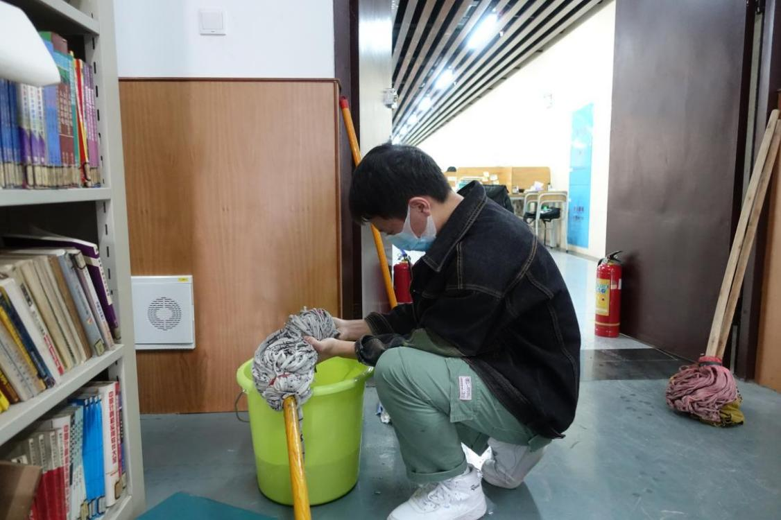 随后,李胜义、邹桂明两位老师带领同学们来到了书库开展志愿劳动。大家分工合作,有些同学负责清扫地面灰尘,有些同学拖地,还有一些人擦拭书架。经过一下午的清扫,同学们将书库打扫得一尘不染。虽然大家的衣服蹭上了灰尘,双手沾满了污水,但是看着干净整洁的书库,都倍感值得。挥汗奋战的机电学子充分发扬了“不怕苦、不怕脏、不怕累”的精神,我们为他们点赞。