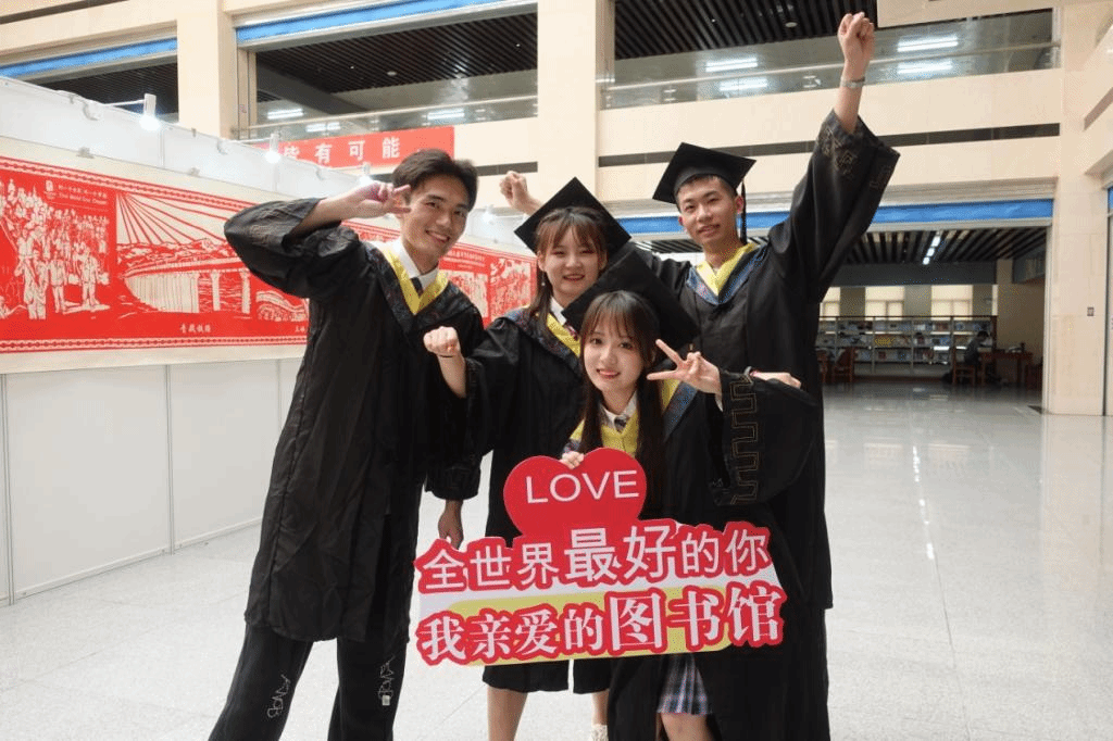 毕业生在图书馆拍照留念