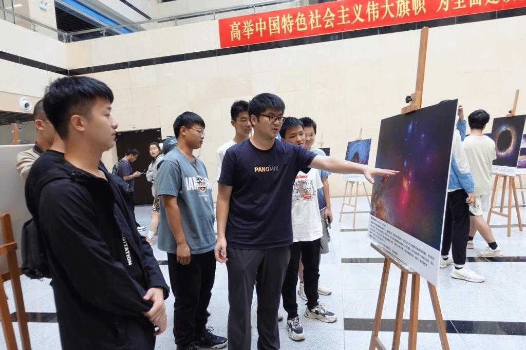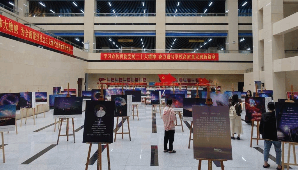 同时,图书馆在一楼中庭举办《浪漫星空》摄影作品展。本次主要展出星野和深空两类摄影作品,共计40幅,由视觉中国签约摄影师谢杰和深空摄影师李令名拍摄。星野作品多为入选了《中国国家天文》《央视网》《人民日报》等优秀作品,展示了不同季节不同拍摄地夜晚的星空,繁星闪烁,不禁让大家陷入对美丽星空的无限遐想。深空作品近距离呈现了遥远太空中的各种星云,如狮子星云、环形星云、马头和火焰星云等,广袤天空中的浩瀚星际给大家强烈的视觉冲击,引得读者纷纷驻足欣赏。