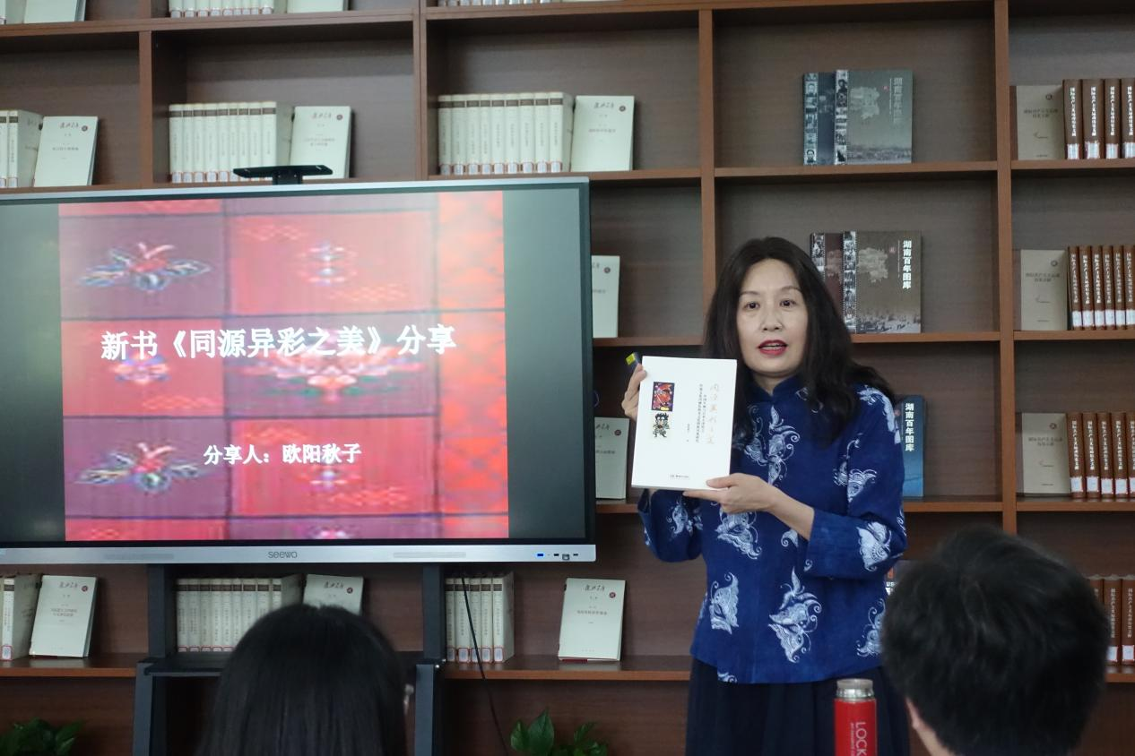 5月23日下午,我校艺术设计学院欧阳秋子教授的专著《同源异彩之美》新书捐赠及分享会在图书馆举行。艺术设计学院党总支书记舒欣、图书馆馆长王永启、艺术设计学院团总支书记阳谦舟、图书馆老师以及来自各学院的同学们参加。