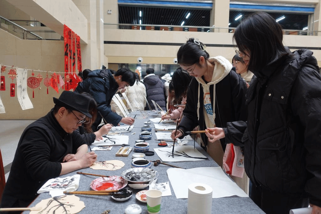 活动现场气氛热烈,多项活动精彩呈现。首先映入眼帘的是“舞狮献瑞”,两只威风凛凛的狮子在欢快的锣鼓声中跳跃舞动,它们的每一个动作都充满了力量和灵动,仿佛在向人们传递着新年的吉祥与祝福;“水墨丹青”区域,大家用画笔蘸着颜料在扇叶上挥洒,一幅幅精美的扇叶水墨画应运而生,尽情表达着对美好生活的向往;“茶香四溢”区域,空气中弥漫着淡淡的茶香,茶艺师们为大家展示了精湛的茶艺表演,从泡茶的水温、时间到茶叶的选择,每一个环节都蕴含着深厚的文化底蕴;“妙笔生花”区域则是书法爱好者的天地,师生们挥毫泼墨,写下自己心仪的春联和“福”字,将自己对新年的美好期望融入到了文字之中;“剪影迎春”区域同样吸引了众多师生的目光,一张普通的红纸,在师生们的手中仿佛有了生命,不一会儿就变成了一幅幅精美的剪纸作品;“投壶问礼”区域则充满了欢声笑语,大家纷纷尝试着将箭投入壶中,感受着古人的智慧和中华博大精深的礼仪文化。