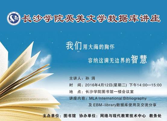 图书馆将于2016年4月12日(星期二)下午14:00—15:00在图书馆一楼会议室举行数字资源培训。培训内容为:MLA International Bibliography 现代英美文学和语言学及EBM-library外文电子书使用及交流分享。MLA International Bibliography是由美国 Modern Language Association(MLA) of America制作的重要学术研究工具,它汇总于全世界的语言、文学、语言学、民俗学等学术领域相关的3,000多种期刊、丛刊,1,000多家出版社出版的图书,以及会议论文集等。该数据库为学校师生科研和学习提供了丰富的外文文献资源,该库对扩展师生对相关研究领域期刊的认识,满足用户日益增长的论文需求有重大帮助。届时欢迎大家参加!