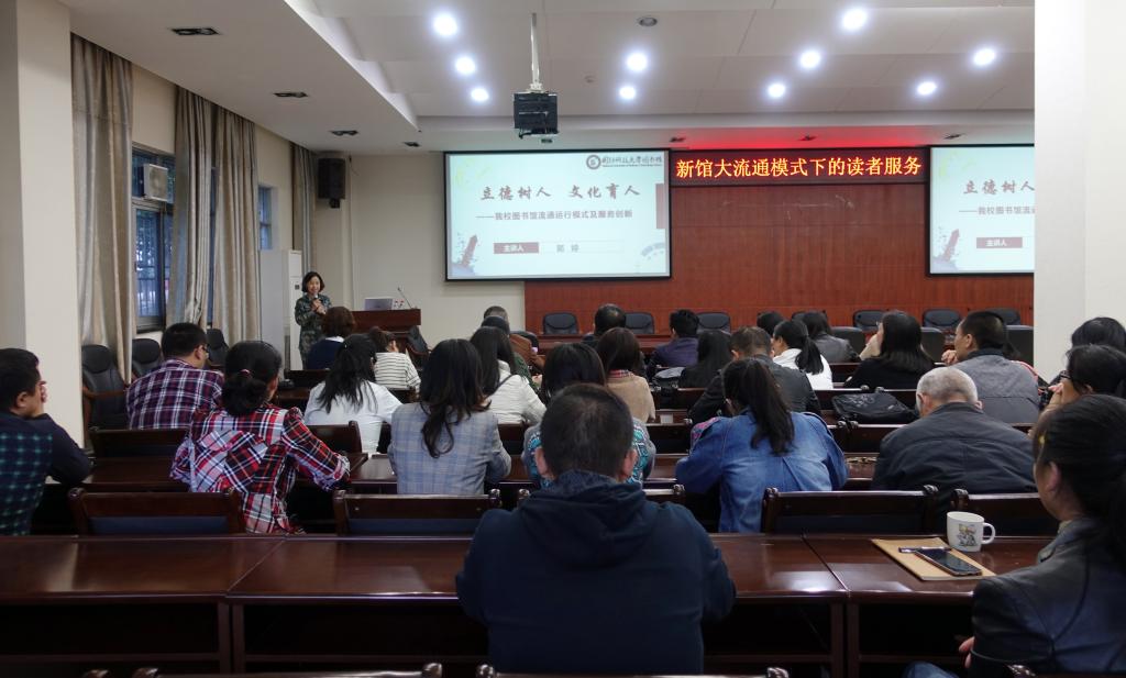 为确保图书馆“不忘初心、牢记使命”主题教育收到实效,切实提升全体馆员的服务意识和综合素质,以适应新形势下高校图书馆发展的需求,10月23日下午,我馆特邀国防科技大学图书馆馆长助理郭婷来馆做了“图书馆流通运行模式及读者服务创新”业务知识培训。本次培训在图书馆一楼会议室举行,由图书馆副馆长符勤主持,图书馆全体馆员参加。