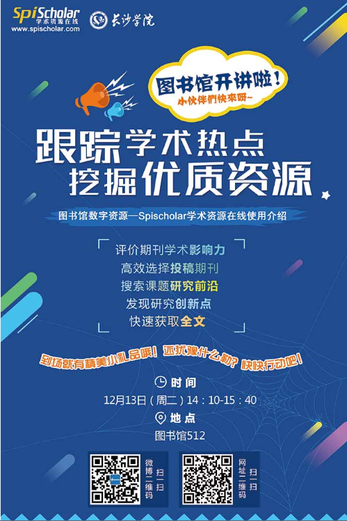 图书馆将于2016年12月13日(星期二)14:10—15:40在图书馆五楼512室举行spischolar学术资源、pad+互动信息平台讲座。