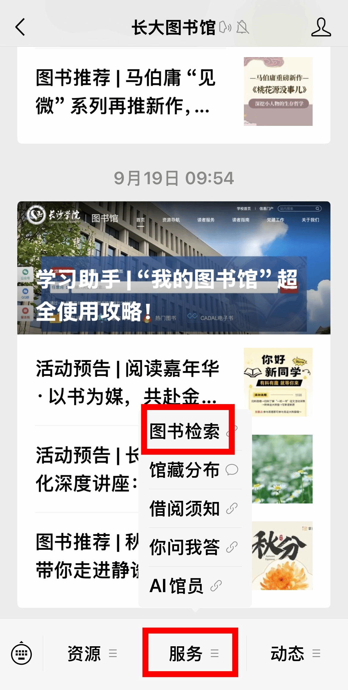 4、登录校园网,在“长大图书馆”官微,底部“服务”栏,选择“图书检索”;
