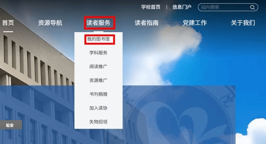 3、登录图书馆网站,选择“读者服务”栏,在下拉菜单里面选择“我的图书馆”;