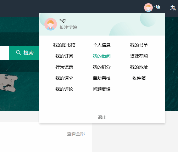 2、登录校园网,移动端访问http://172.17.33.88:8015/,PC端访问http://172.17.33.88:8013/;或登录图书馆网页--读者服务--我的图书馆,输入学号(或工号)登录(不必注册),密码与登录信息门户的密码一致,忘记密码可根据页面提示自行找回,进入以下页面,鼠标点击右上角个人图像,在下拉菜单里面点击“我的借阅”进行查询。